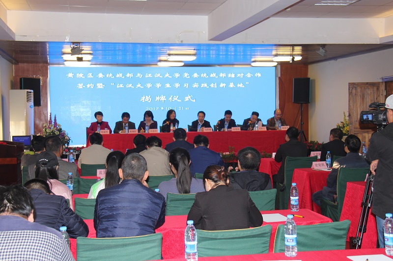 為認(rèn)真貫徹落實(shí)黨的十九大精神,推動(dòng)統(tǒng)戰(zhàn)工作創(chuàng)新實(shí)踐,打造同心服務(wù)品牌,共同促進(jìn)統(tǒng)戰(zhàn)事業(yè)發(fā)展,10月31日下午,江漢大學(xué)黨委統(tǒng)戰(zhàn)部與黃陂區(qū)委統(tǒng)戰(zhàn)部在黃陂云霧山簽訂了共建協(xié)議。武漢市委統(tǒng)戰(zhàn)部副部長(zhǎng)馬哲智、黃陂區(qū)委常委何憲禮、江漢大學(xué)副校長(zhǎng)張英參加了簽約儀式,并為設(shè)立在黃陂云霧山的“江漢大學(xué)學(xué)生學(xué)習(xí)實(shí)踐創(chuàng)新基地”揭牌。