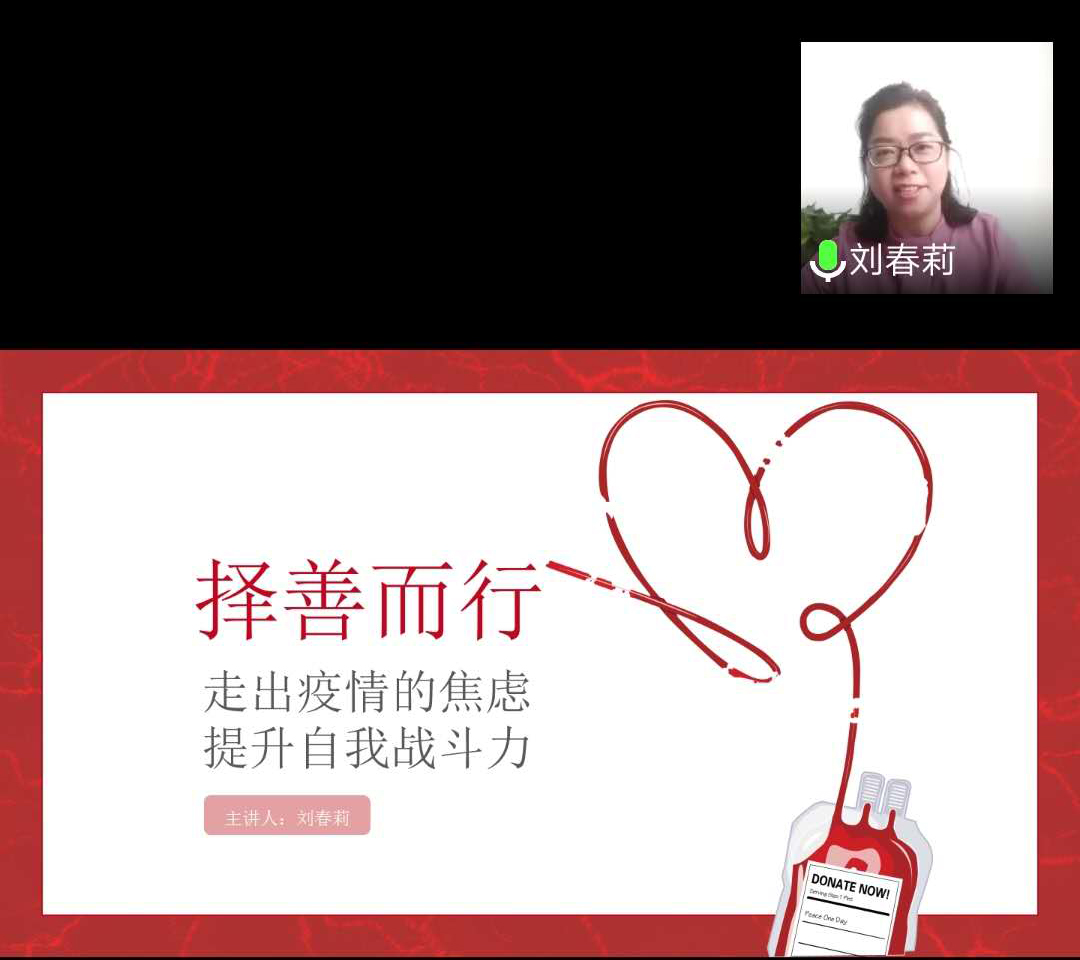 邀請(qǐng)的主講嘉賓是漢川市知聯(lián)會(huì)副會(huì)長(zhǎng)、漢川市春暉社會(huì)工作服務(wù)中心負(fù)責(zé)人劉春莉,她以《走出疫情的焦慮、提升自我戰(zhàn)斗力》為題,從面對(duì)疫情,如何處理焦慮情緒、如何把家打造成自己的“能量加油站”、如何讓自己在工作中收獲價(jià)值感等三個(gè)方面,深入淺出地講解“一致性溝通”、“傾聽(tīng)六步驟”等心理學(xué)相關(guān)知識(shí)和方法技巧,引導(dǎo)大家通過(guò)采取找人傾訴、減壓放松、轉(zhuǎn)變觀念等方法來(lái)緩解壓力增強(qiáng)信心,幫助大家正確處理好家人和他人的關(guān)系,更好地戰(zhàn)勝克服疫情產(chǎn)生的焦慮、回歸到正常的工作生活中去。