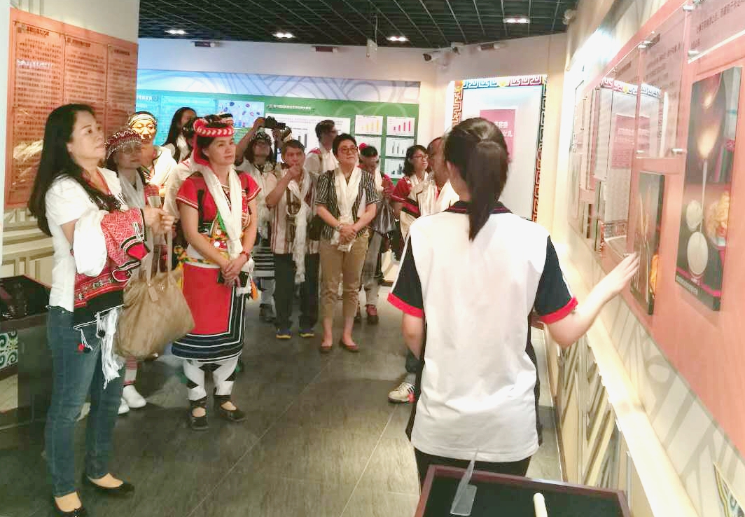 在中南民族大學(xué),著民族盛裝的參訪團一行受到了校黨委常委、副校長杜冬云的熱烈歡迎。他向來賓介紹了學(xué)校的歷史沿革、發(fā)展情況,以及學(xué)校始終堅持“面向少數(shù)民族和民族地區(qū),面向地方,面向全國,為少數(shù)民族和民族地區(qū)服務(wù),為黨和國家的民族工作服務(wù),為國家戰(zhàn)略需求服務(wù)”的辦學(xué)宗旨和成果。學(xué)校有關(guān)領(lǐng)導(dǎo)和老師就民族理論與政策、校園文化建設(shè)情況、少數(shù)民族學(xué)生培養(yǎng)、民族教育工作情況等方面進行了全面介紹和經(jīng)驗分享。參訪團一行還參觀了中南民族大學(xué)民族學(xué)博物館。講解員向大家介紹了館內(nèi)珍藏的29個少數(shù)民族的一萬多件服飾、民俗、民族工藝品等,讓大家領(lǐng)略了中華民族豐富多彩的少數(shù)民族文化風(fēng)情。在臺灣展廳內(nèi),參訪團成員紛紛駐足,與自己的民族服飾藏品合影留念。