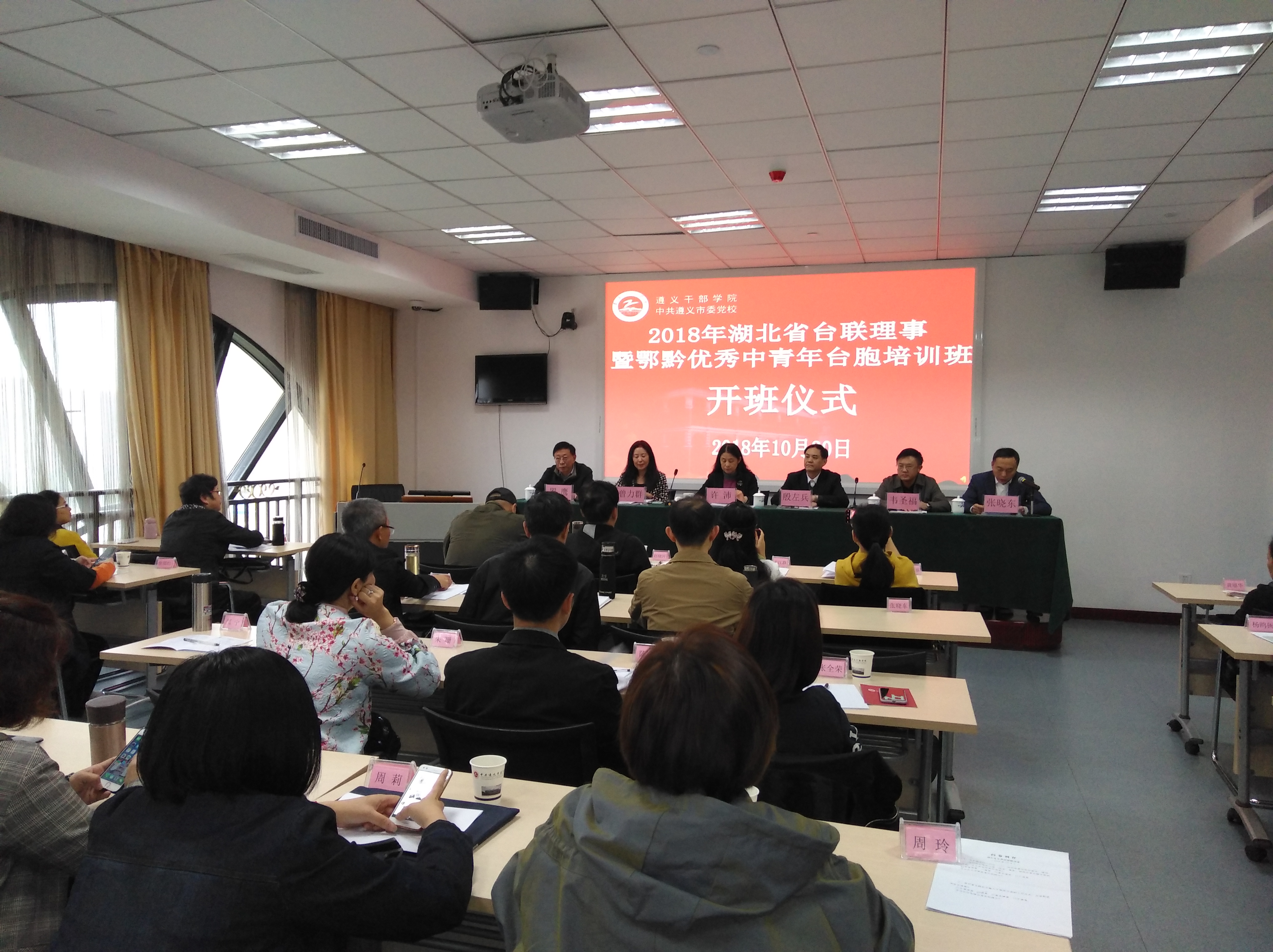 10月30日,2018年湖北省臺(tái)聯(lián)理事暨鄂黔優(yōu)秀中青年臺(tái)胞培訓(xùn)班在貴州省遵義市舉行了開(kāi)班式。全國(guó)臺(tái)聯(lián)副會(huì)長(zhǎng)、重慶市臺(tái)聯(lián)會(huì)長(zhǎng)許沛,貴州省臺(tái)聯(lián)會(huì)長(zhǎng)曾力群,湖北省臺(tái)聯(lián)專職副會(huì)長(zhǎng)兼秘書(shū)長(zhǎng)羅鷹,湖北省臺(tái)聯(lián)副會(huì)長(zhǎng)張曉東,貴州省臺(tái)聯(lián)專職副會(huì)長(zhǎng)陳建強(qiáng),中共遵義市委黨校常務(wù)副校長(zhǎng)韋圣福、湖北省委統(tǒng)戰(zhàn)部聯(lián)絡(luò)處三級(jí)調(diào)研員殷左兵等領(lǐng)導(dǎo)出席開(kāi)班式。開(kāi)班式由湖北省臺(tái)聯(lián)副會(huì)長(zhǎng)張曉東主持。來(lái)自鄂黔兩省優(yōu)秀中青年臺(tái)胞及兩省臺(tái)聯(lián)機(jī)關(guān)干部近50人參加了開(kāi)班式。