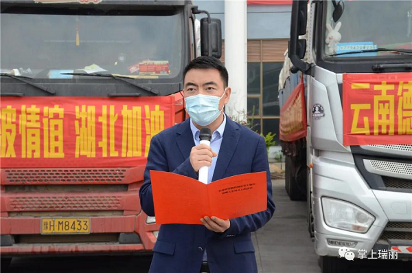 捐贈(zèng)過(guò)程中,云南省德宏州委常委、統(tǒng)戰(zhàn)部部長(zhǎng)任遠(yuǎn)征表示,希望云南德宏和湖北十堰兩座中國(guó)十佳魅力城市同心協(xié)力共抗疫情,為打贏疫情防控攻阻擊戰(zhàn),勠力同心、并肩作戰(zhàn),共同奪取疫情防控全面勝利。
