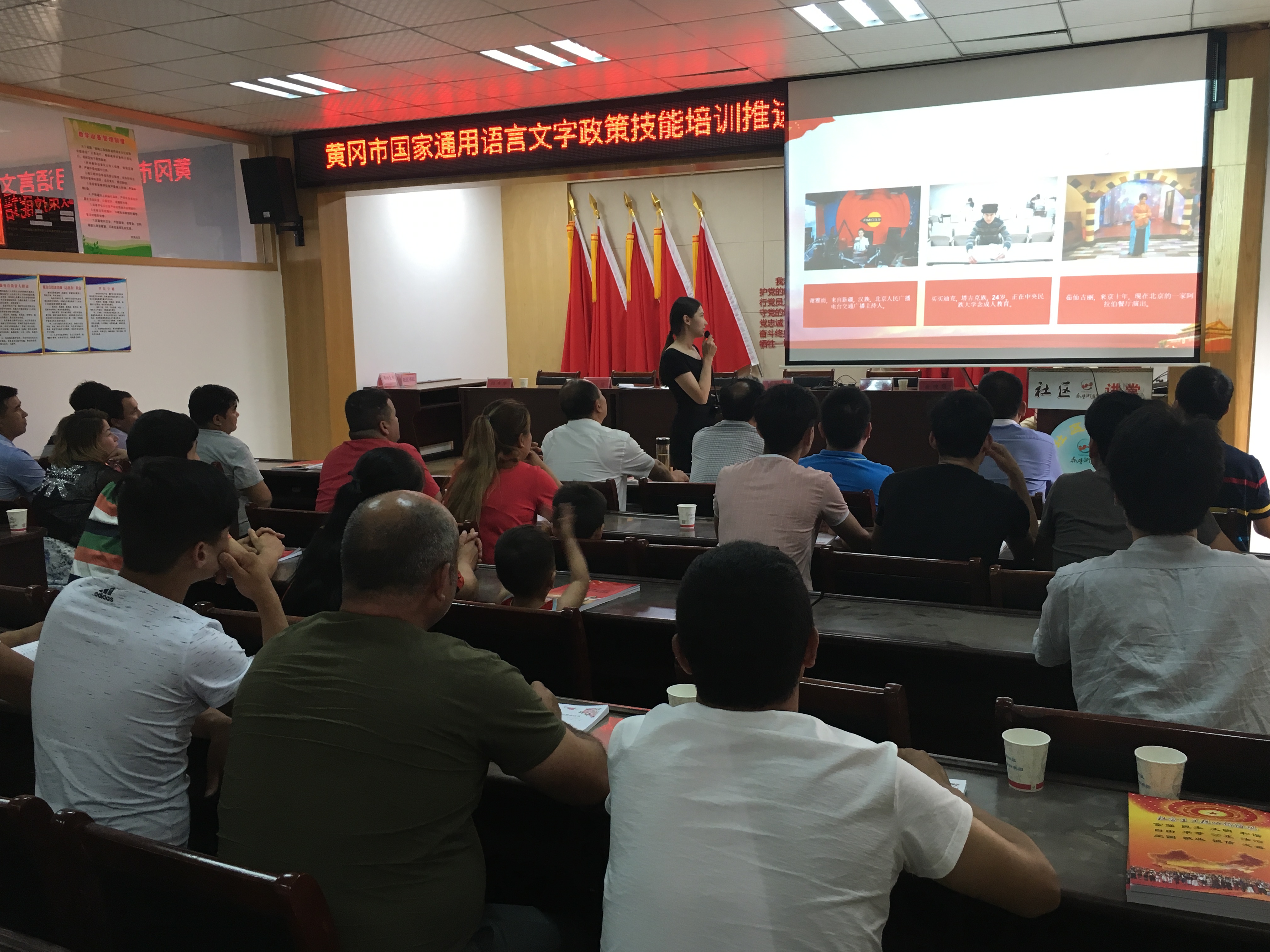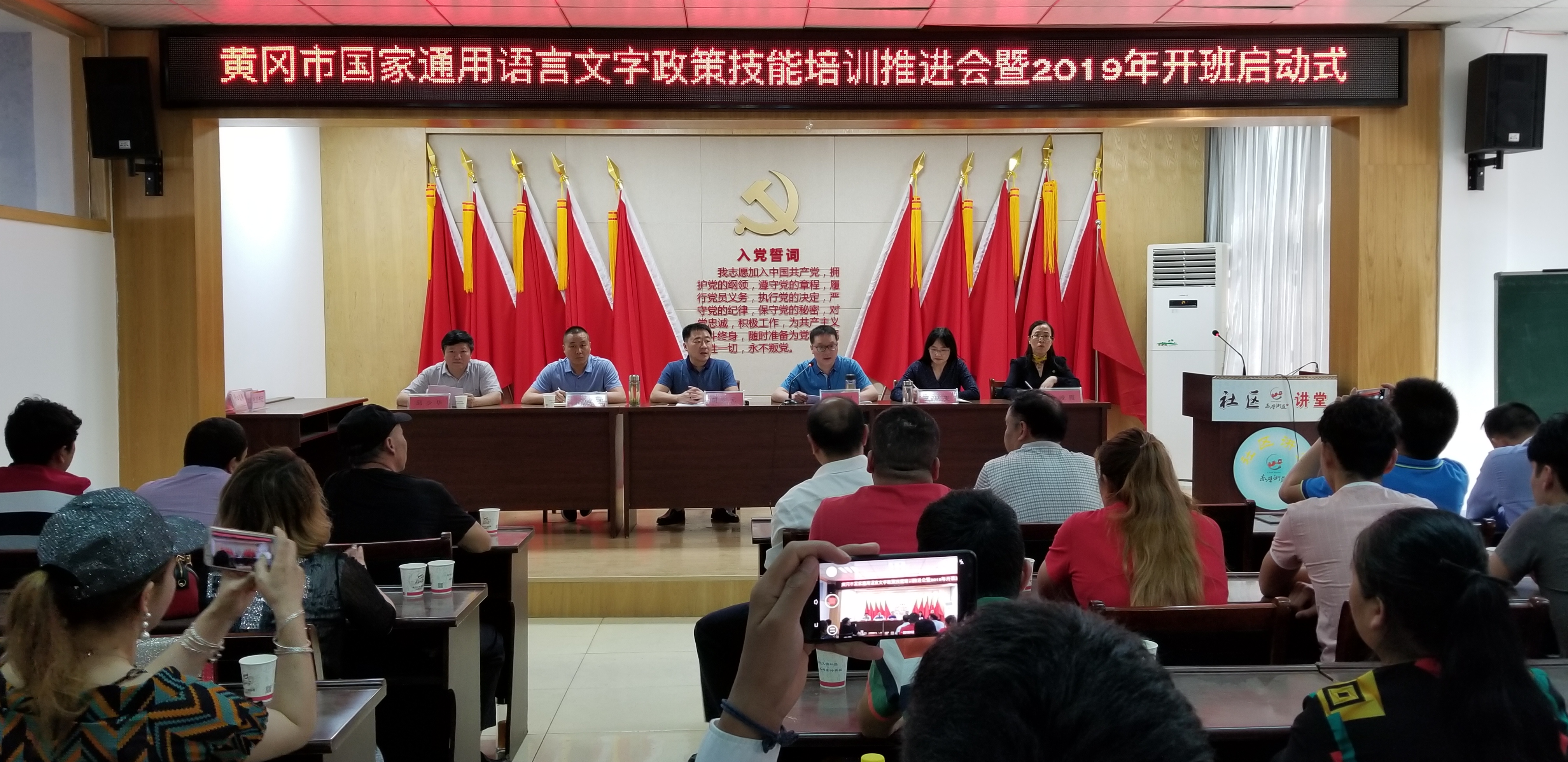 啟動儀式后,現(xiàn)場奏唱《中華人民共和國國歌》,全體參會人員進行公民宣誓,黃岡師范學院教師進行集中授課。黃岡師范學院學工部部長余晚霞,示范培訓點所在社區(qū)負責人,各縣(市、區(qū))黨委統(tǒng)戰(zhàn)部、民宗部門分管領(lǐng)導,以及在黃少數(shù)民族務(wù)工人員參加啟動式。