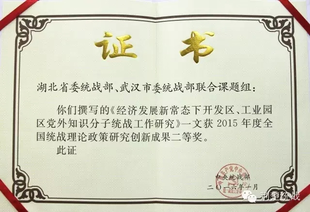 在2015年度全國統(tǒng)戰(zhàn)理論政策研究創(chuàng)新成果中,湖北省委統(tǒng)戰(zhàn)部和武漢市委統(tǒng)戰(zhàn)部聯(lián)合撰寫的《經(jīng)濟(jì)發(fā)展新常態(tài)下開發(fā)區(qū)、工業(yè)園區(qū)黨外知識分子統(tǒng)戰(zhàn)工作研究》被評為二等獎(jiǎng),省委統(tǒng)戰(zhàn)部撰寫的《關(guān)于加強(qiáng)專業(yè)人士統(tǒng)戰(zhàn)工作的調(diào)查與思考》、省社會主義學(xué)院撰寫的《以章治黨:法治視野下的民主黨派建設(shè)之路徑探析》、中國統(tǒng)戰(zhàn)理論研究會黨外知識分子統(tǒng)戰(zhàn)工作湖北研究基地和省委統(tǒng)戰(zhàn)部聯(lián)合撰寫的《“塔西佗陷阱”與自媒體時(shí)代黨外知識分子工作策略研究》三篇文章被評為三等獎(jiǎng)。