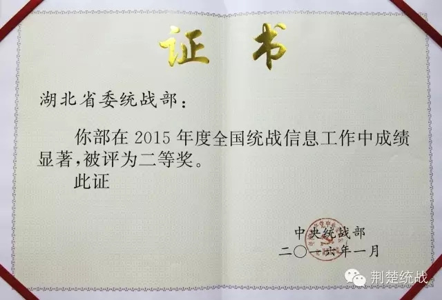湖北省委統(tǒng)戰(zhàn)部信息工作被評為全國統(tǒng)戰(zhàn)信息工作二等獎(jiǎng),一名同志被評為優(yōu)秀信息員。