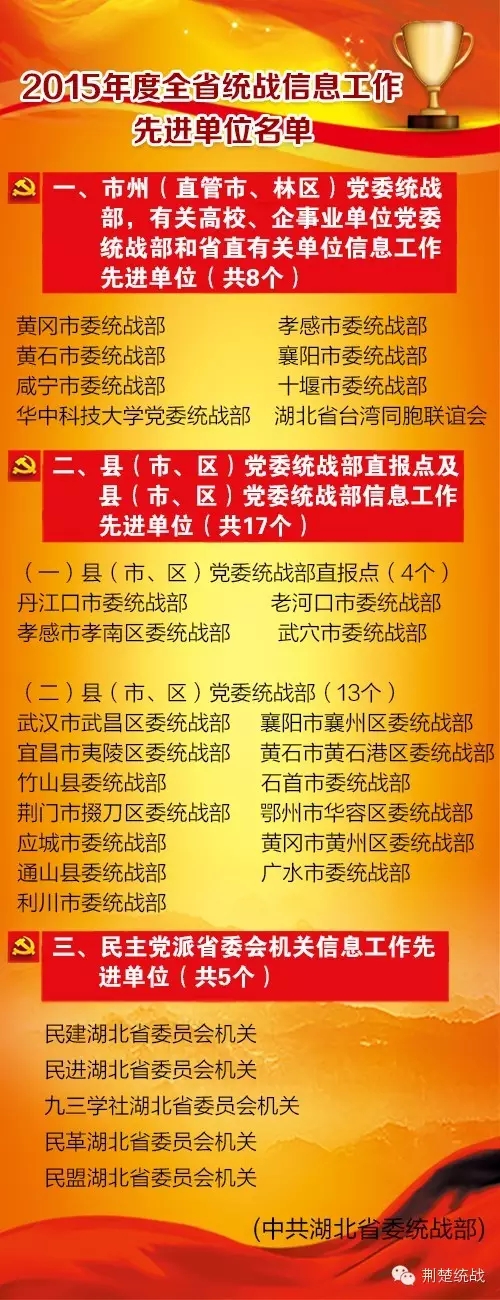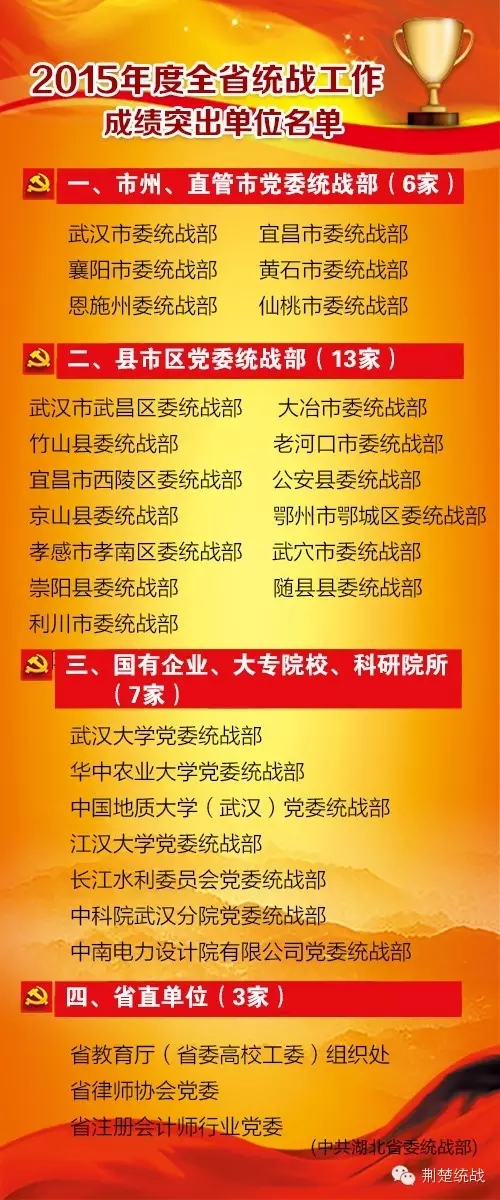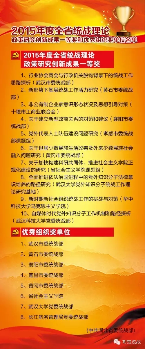 在今年全省統(tǒng)戰(zhàn)部長會議上,湖北省委統(tǒng)戰(zhàn)部對2015年度全省統(tǒng)戰(zhàn)工作成績突出單位、全省統(tǒng)戰(zhàn)信息工作先進(jìn)單位和優(yōu)秀信息員、全省統(tǒng)戰(zhàn)理論政策研究創(chuàng)新成果進(jìn)行了通報表揚(yáng),以樹立標(biāo)桿,激勵先進(jìn),推動工作。一起來看看光榮榜里都有哪些先進(jìn)單位吧!